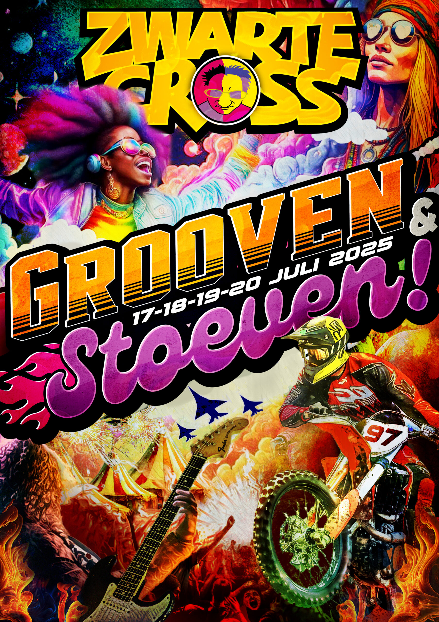 Op de crossbaan wisselden de meest waanzinnige bouwwerken (met nieuw dit jaar: de Levendenherdenkingsklasse en de Foodtruck-klasse) de verschillende topsportklassen af. In de finale van de Zwarte Cross Open, onze eigen crosscompetitie, bleken Cohen Llewellyn (50cc), Damian Wedage (125cc), Kjeld Stuurman (Open Classic), Mike Pijnen (85cc), Jeffrey Meurs (125cc classic), Lotte van Drunen (Ladies Cup), Mirco ten Kate (250cc), Sven van der Mierden (500cc+Superfinale) de snelste op het parcours van de Schans.