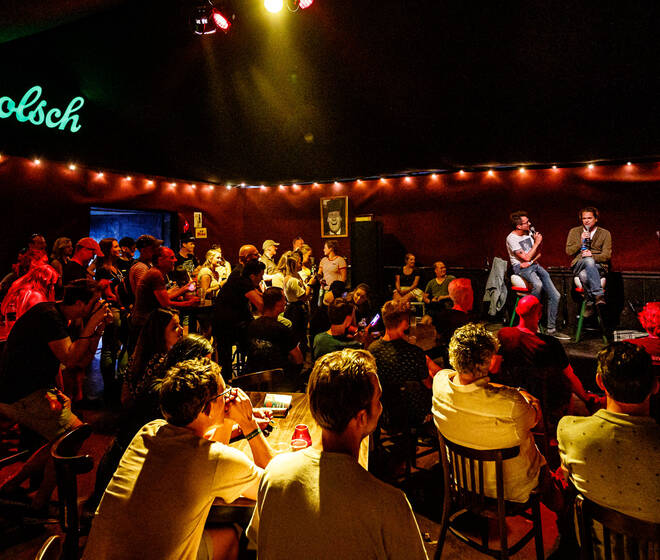 Duik die comedyclub in, grijp een biertje en geniet van de geweldige huisband Montis, Goudsmit & Directie voordat de lachspieren geactiveerd gaan worden.