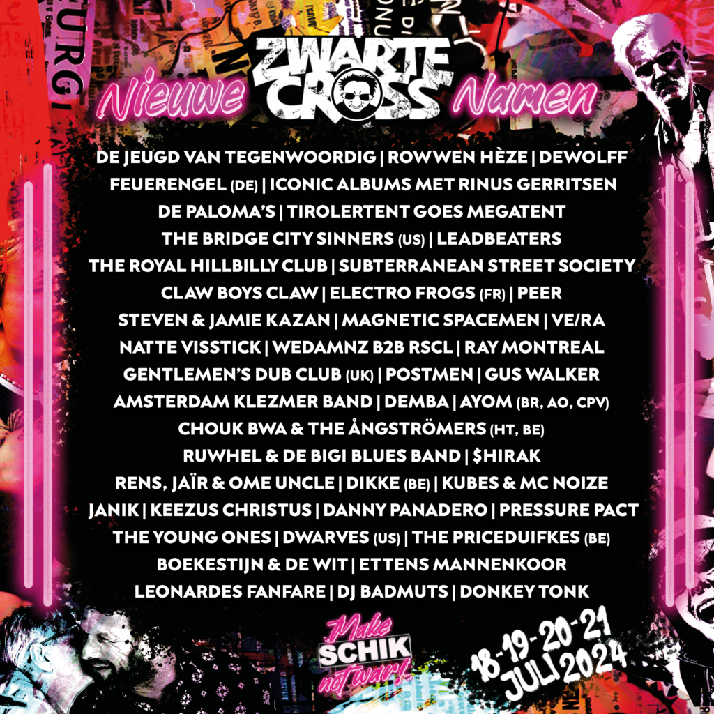 De Jeugd van Tegenwoordig | Rowwen Hèze | DeWolff | Feuerengel (DE) | Iconic Albums met Rinus Gerritsen | De Paloma’s | Tirolertent goes Megatent | The Bridge City Sinners (US) | Leadbeaters | The Royal Hillbilly Club | Subterranean Street Society | Claw Boys Claw | Electro Frogs (FR) | PEER | Steven & Jamie Kazan | Magnetic Spacemen | VE/RA | Natte Visstick | WeDamnz b2b RSCL | Ray Montreal | Gentlemen’s Dub Club (UK) | Postmen | Gus Walker | Amsterdam Klezmer Band | Demba | Ayom (BR, AO, CPV) | Chouk Bwa & The Ångströmers (HT, BE) | Ruwhel & De Bigi Blues Band | $hirak | Rens, Jaïr & Ome Uncle | Dikke (BE) | Kubes & MC Noize | JANIK | Keezus Christus | Danny Panadero | Pressure Pact | The Young Ones | Dwarves (US) | The Priceduifkes (BE) | Boekestijn & De Wit | Ettens Mannenkoor | | Leonardes Fanfare | DJ Badmuts | Donkey Tonk