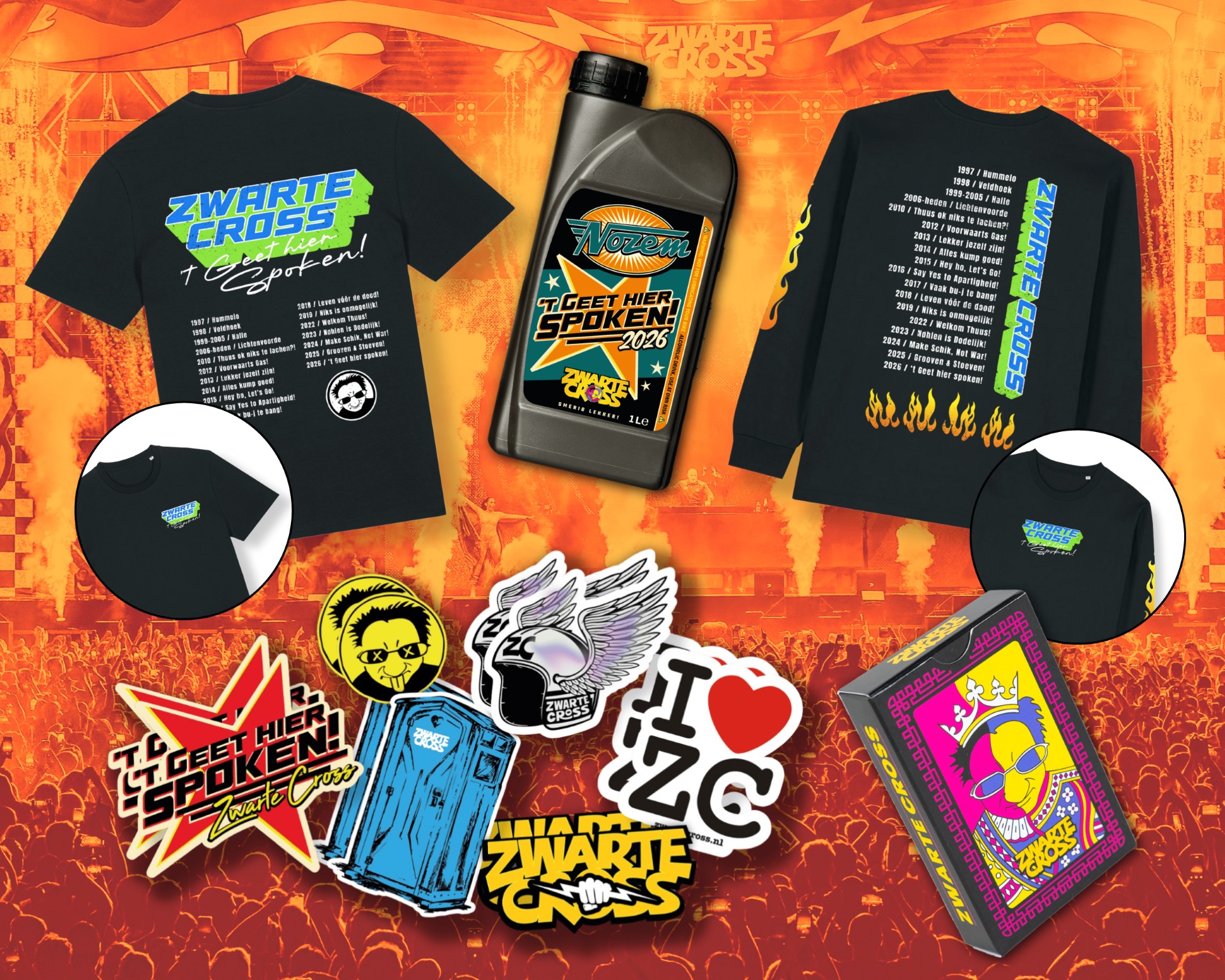 De geesten van de Achterhoek zijn losgebroken, want ‘t geet hier spoken!!! Onze huisorakelachtige ontwerpers hebben de handen uit de long-sleeves getrokken en een reeks spookachtige parels bezworen: ‘t geet hier spoken! T-shirt, de long sleeve voor wie ook in de nacht wil paraderen, een stickerset die gitaren, caravans en kantoorspul laat schrikken, het Tante Rikie kaartspel voor een hevig potje bridgen, en de vermaarde Nozem Oil literfles voor wie het vuur smerig wil voeden. Deze set is een lofrede aan iedereen die de Zwarte Cross niet bezoekt, maar belaagt. De voorraad is beperkt en de vingers zijn snel, dus als je wat spoken wilt vangen moet je rap zijn, want weg is op.