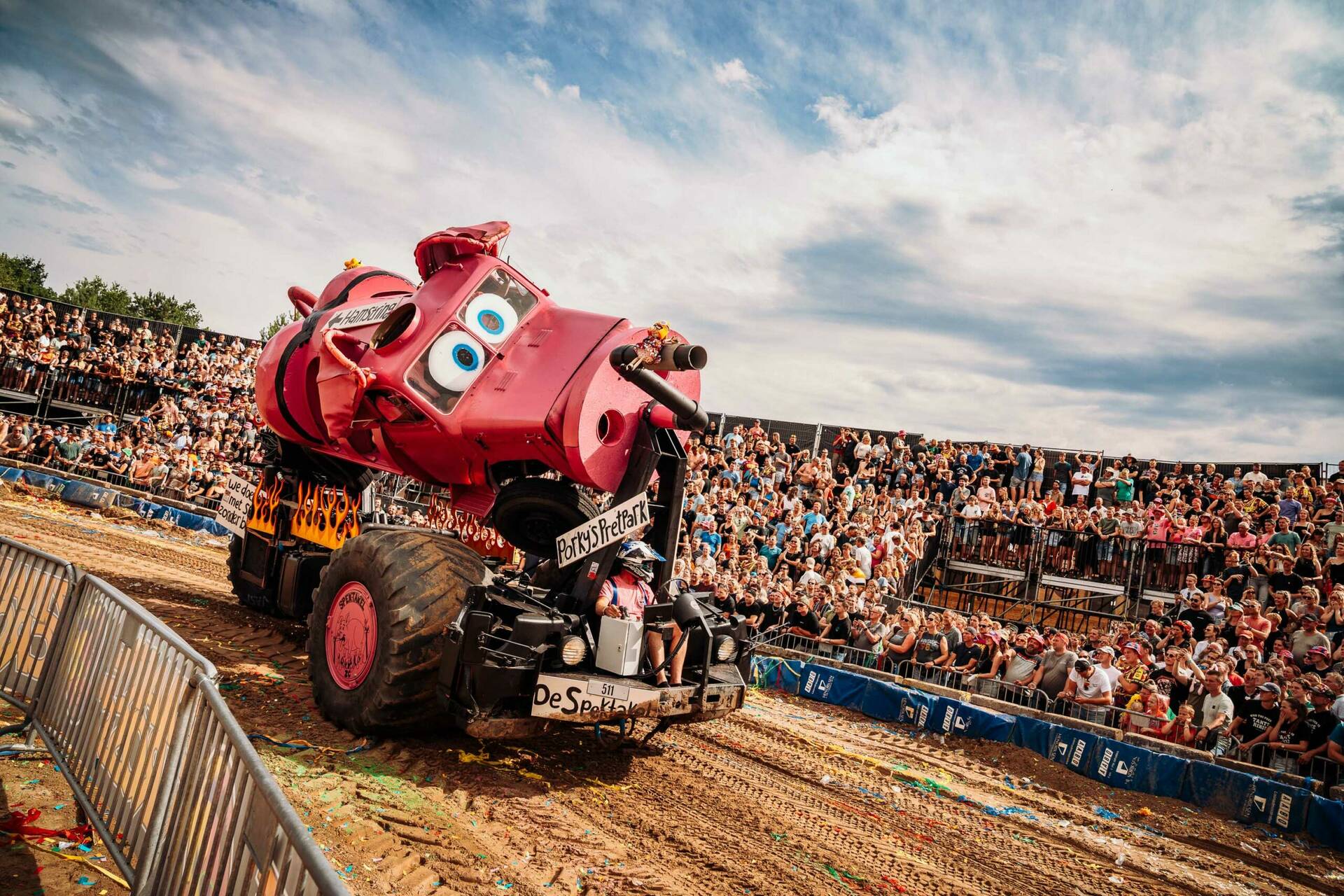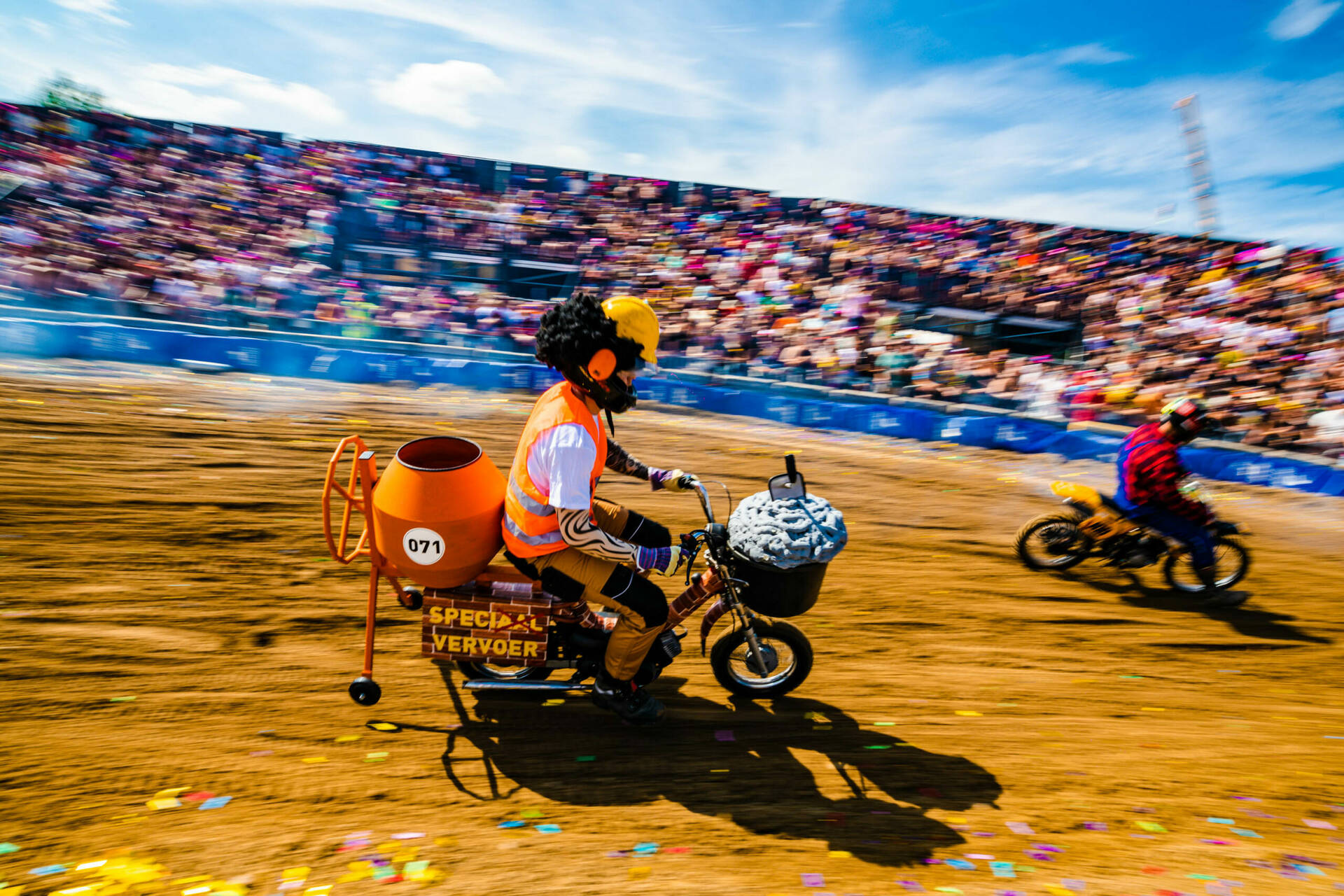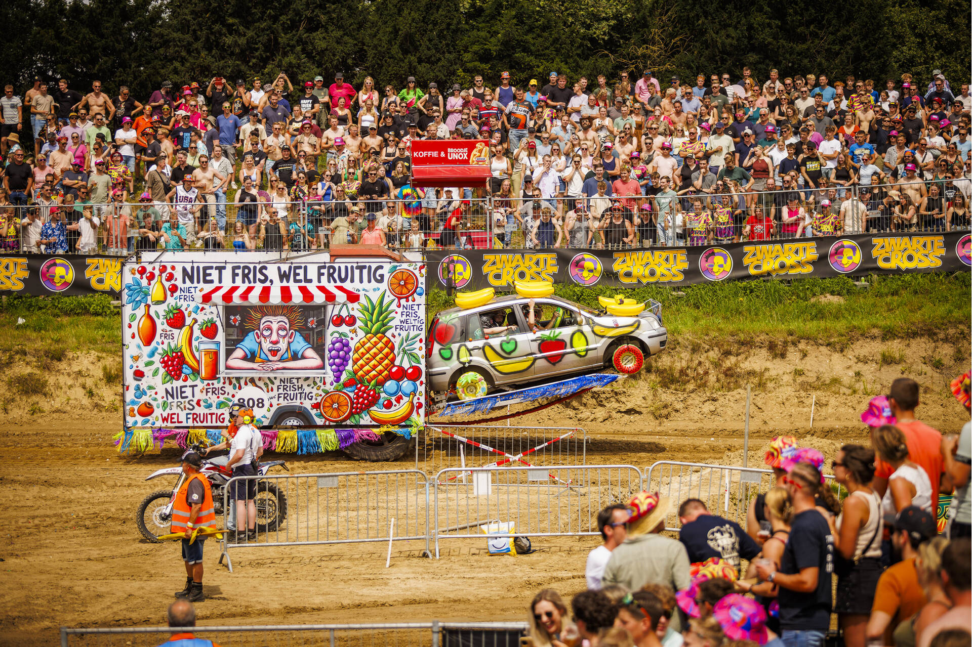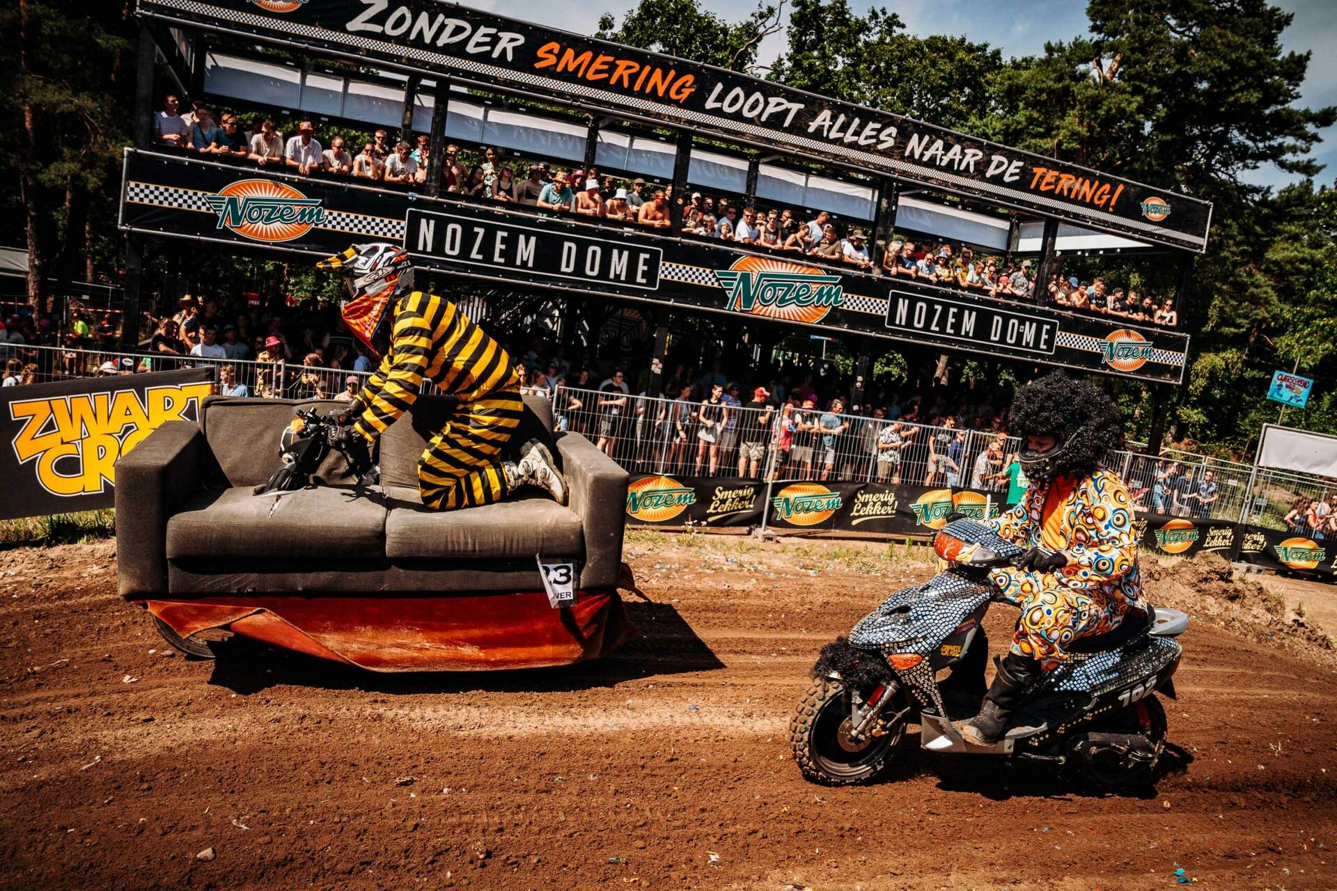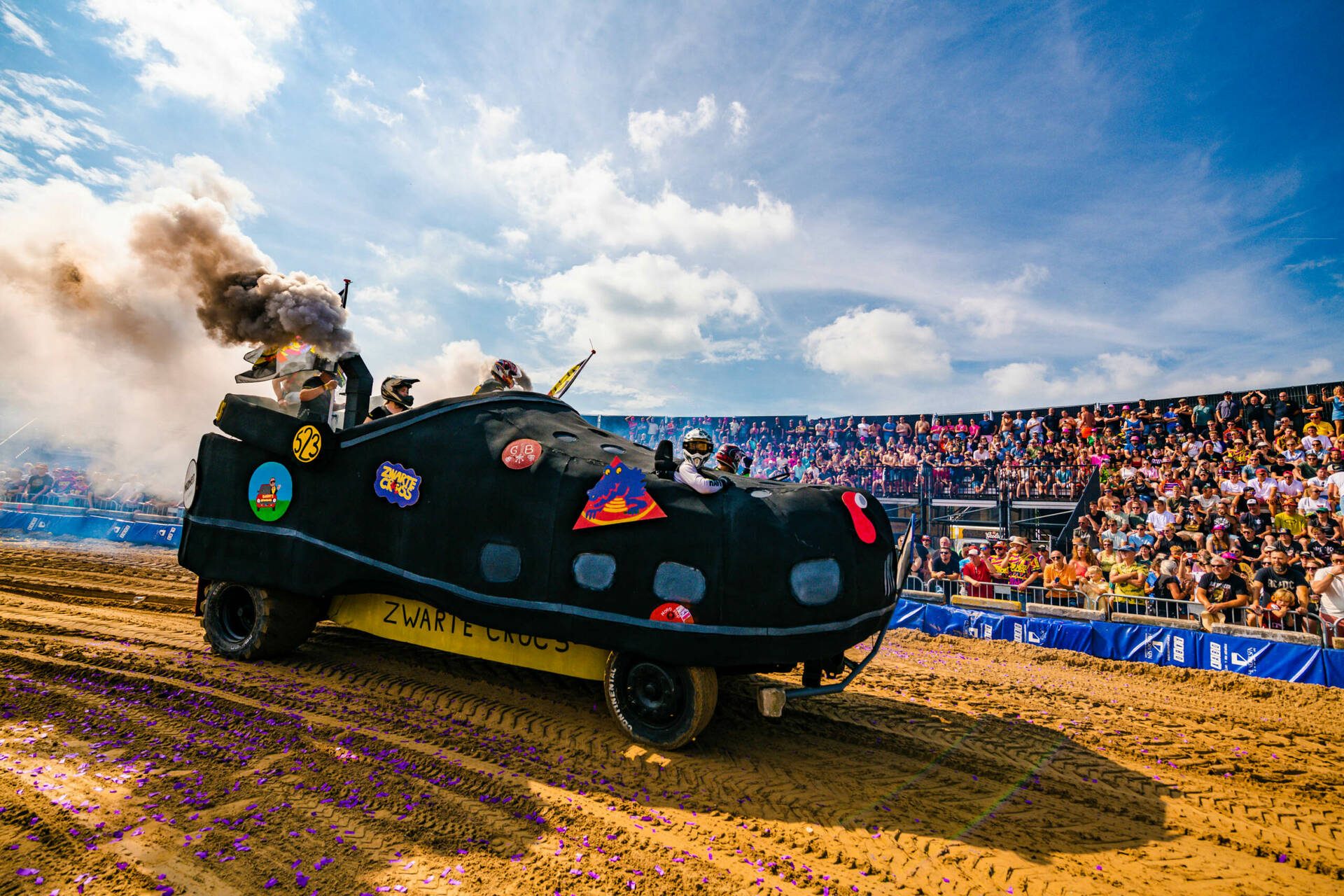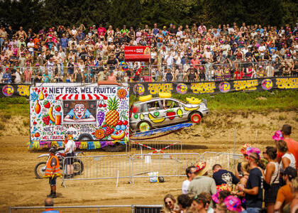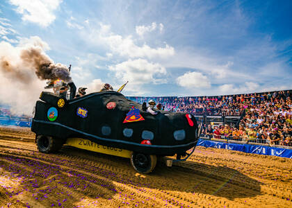 De crossbaan van de Zwarte Cross is een arena vol opspattend zand, heng-heng-hengende motoren, gierende snelheden en de meest krankzinnige rijdende bouwwerken. Van een Dixi-karavaan met Baby Shark-luchthoorn tot de wereldtop van de motorcross en van een boze M&M op een brommer tot crossende kids in de Calimeroklasse, het komt allemaal voorbij in een vier dagen lange, ronkende, rokende en oogverblindende optocht.
