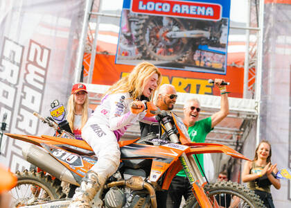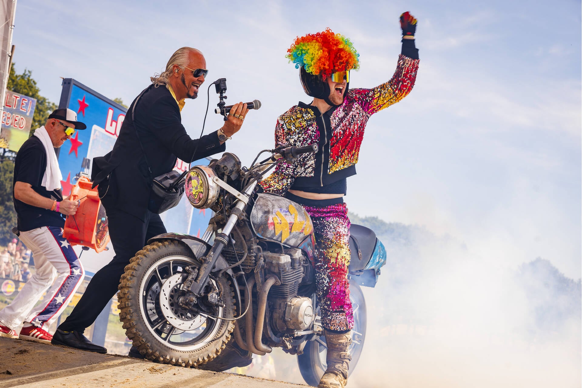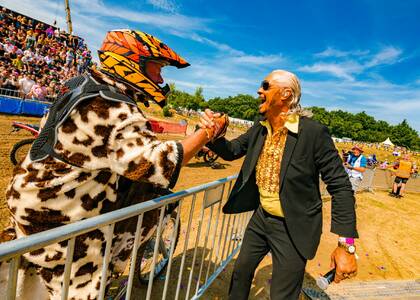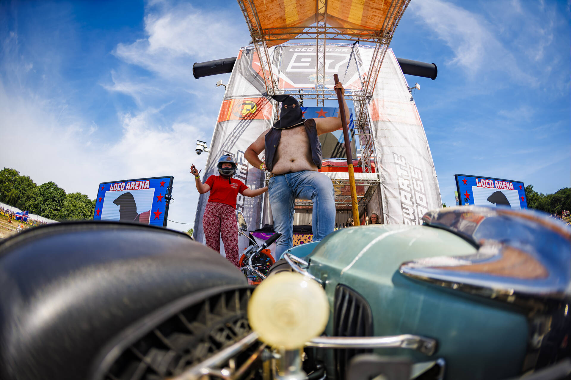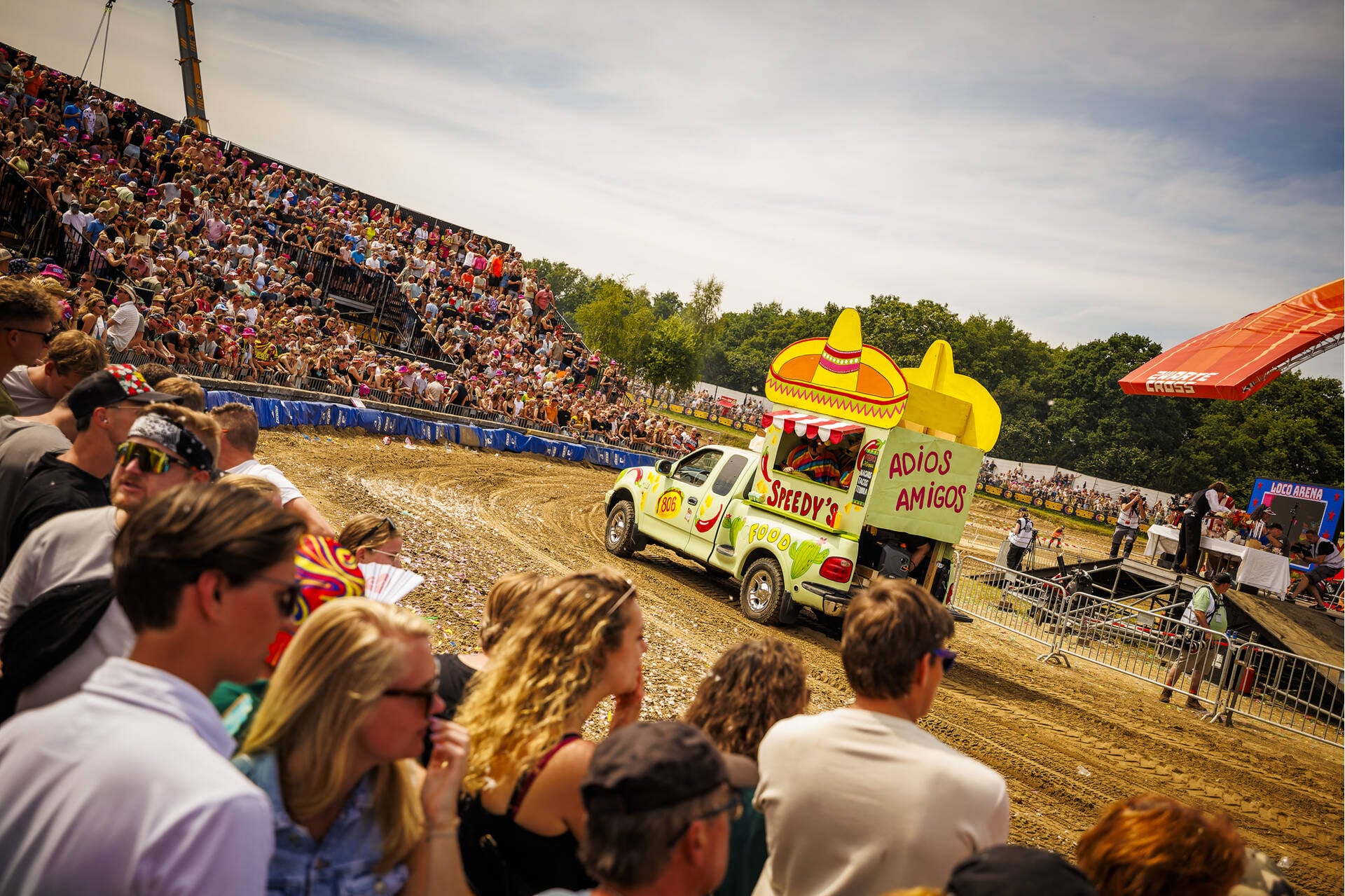 Een van de beste plekken langs de crossbaan! Middenin de Loco Arena houden onze kameraden van de Loco Loco Discoshow het feest aan de gang.